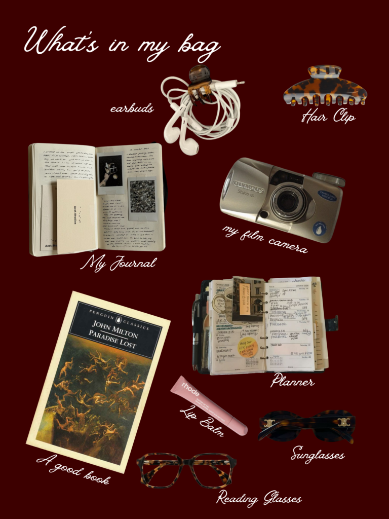My bag reflects my love for storytelling: tools to notice details, feel the moment, capture it, and share what connects us. I always carry my journal for raw ideas and drafts, a film camera for timeless shots, a calendar to make space for real connections, and other basics. I like to believe that I am someone who notices, feels, captures, and shares the human experience in ways that connect people to something bigger (each other, beauty, truth, God).